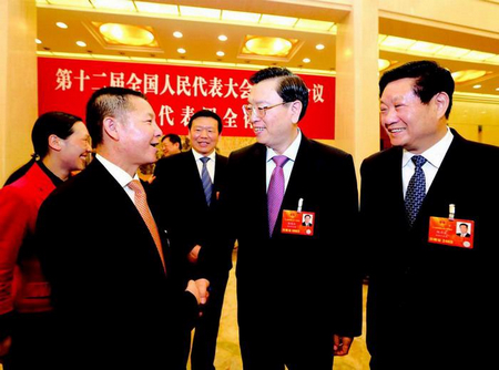 (中共中央政治局常委、国务院副总理张德江与陕西省代表团代表亲切交谈。)